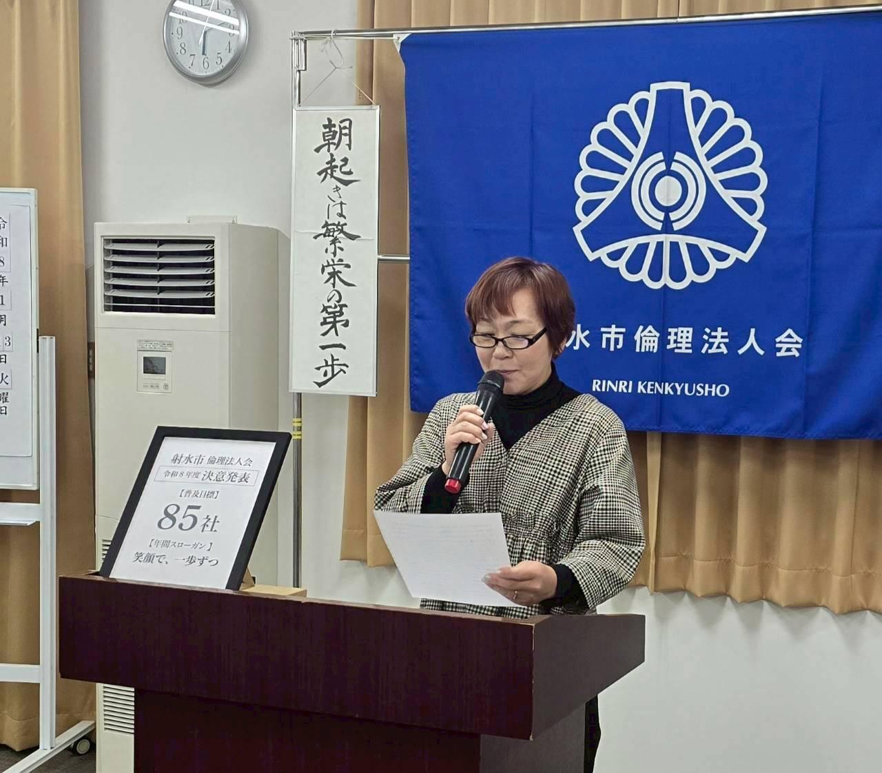 会員スピーチは、射水市倫理法人会 会員で三谷梨農園の三谷 晴代さんでした。