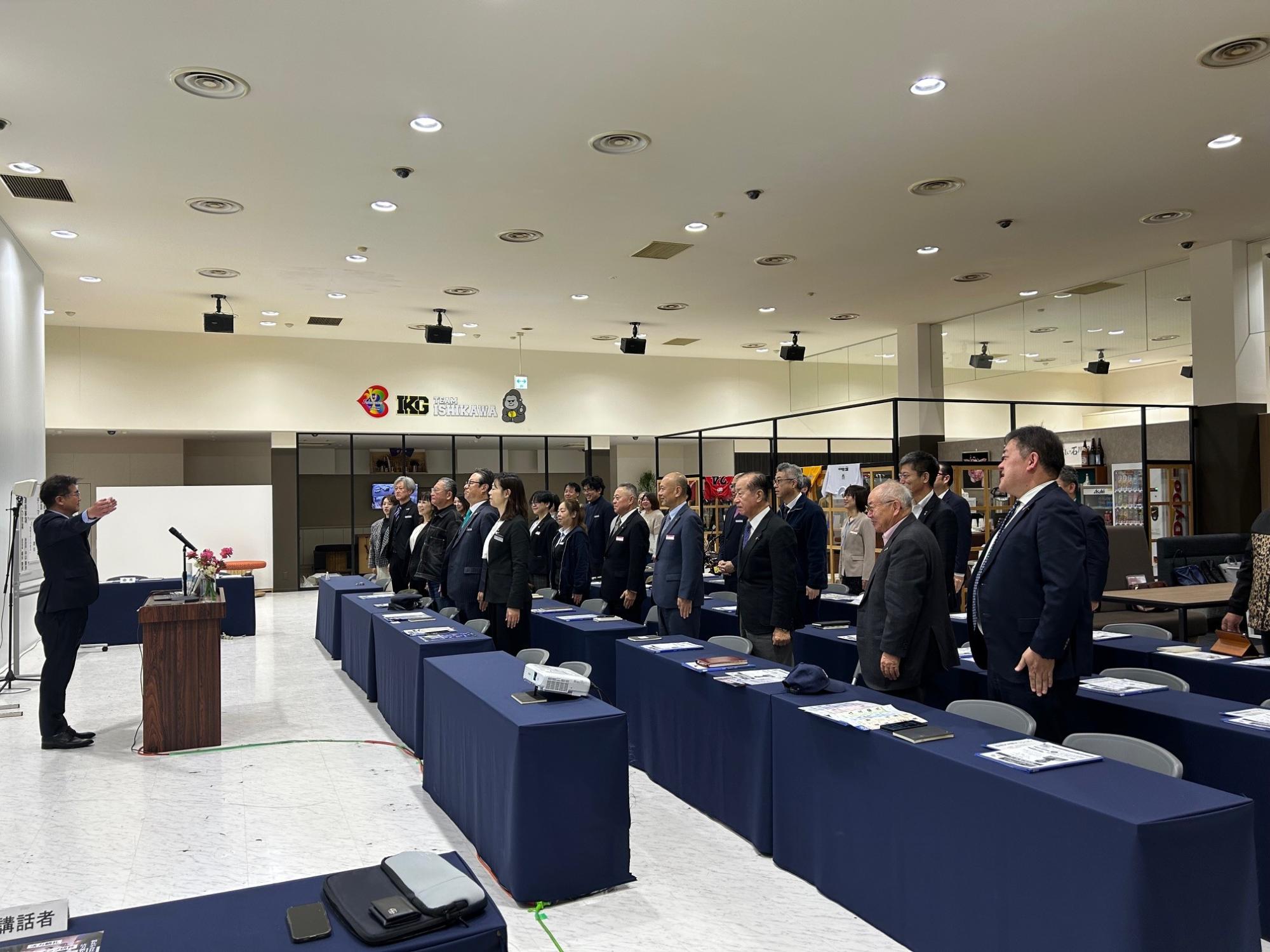 講話の冒頭には、山下氏指揮の下、参加者全員で心をあわせる場面もありました。